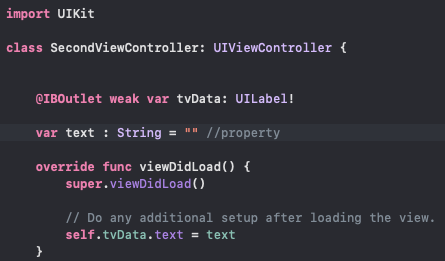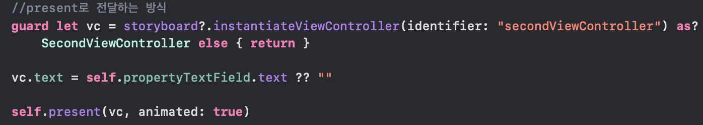 vc.text = self.propertyTextField.text ?? "" //기본값은 "", 두번째 뷰 컨트롤러의 Text를 textfield의 text로 지정