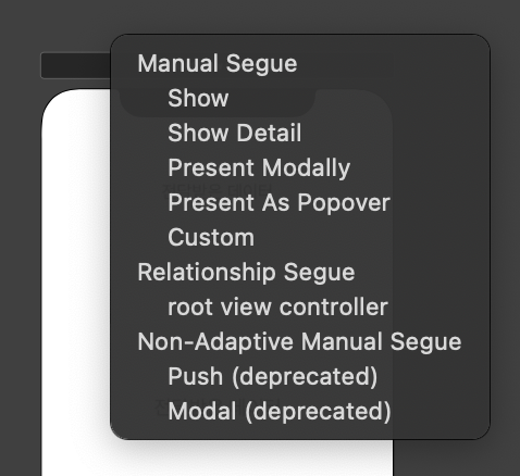 첫번째 뷰컨트롤러에서 두번째 컨트롤러까지 control을 누른 상태에서 끌어오게 되면, 위와같은 창이 생김!