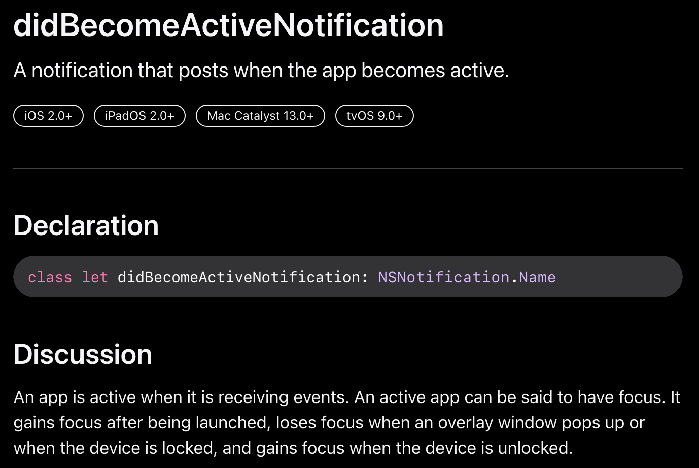 - 여기서 따로 post가 없는 이유는, didBecomeActiveNotification 자체가 active 상태일 때 이를 옵저빙 하고 있는 옵저버에게 notification을 post해주기 떄문이다!
