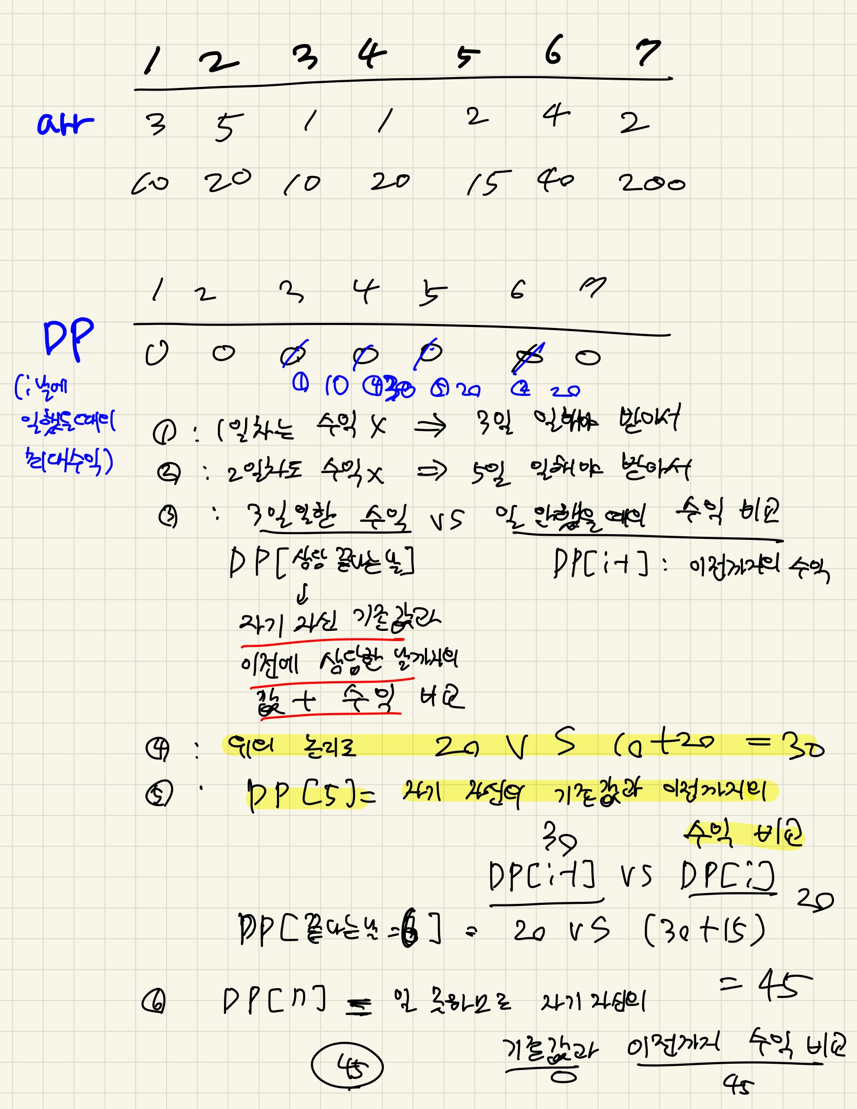 dp[i] = max(dp[i-1], dp[i]) // 자기 날짜의 기존 수익 값과 이전까지 일했을 때의 값이 곧 그날까지 얻을 수 있는 수익의 최대값