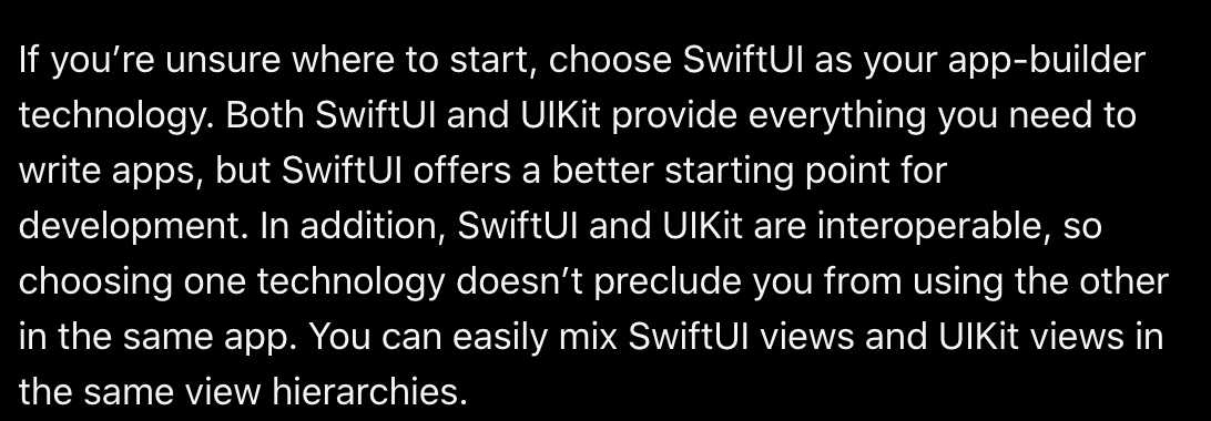 - UIKit과 SwiftUI 중에 뭘 골라야할지 모르겠다면, SwiftUI를 골라라. 더 나은 개발 포인트를 제공할 것이다.