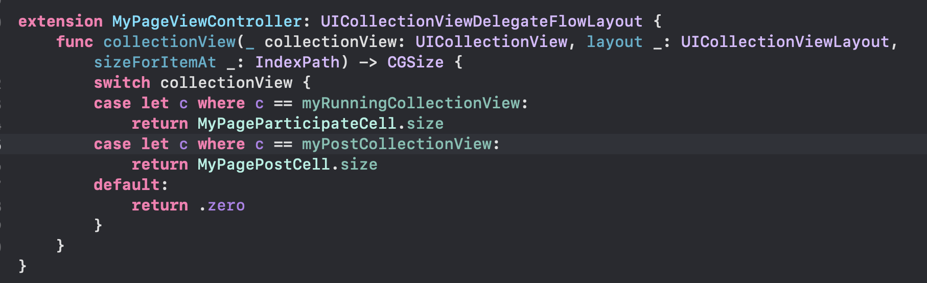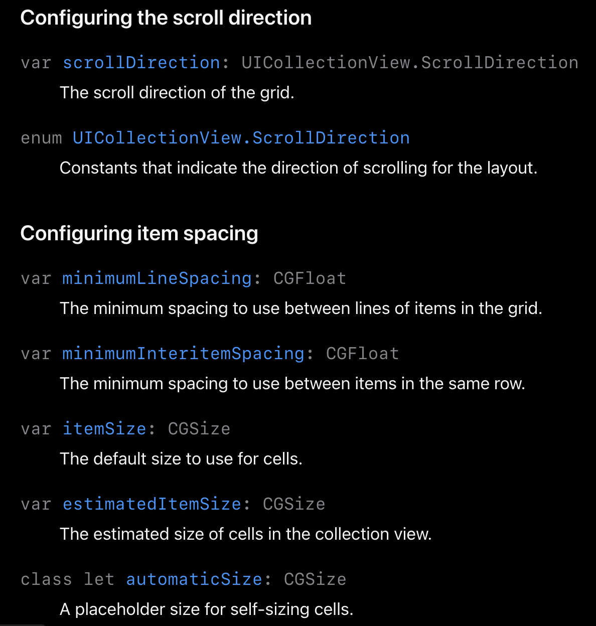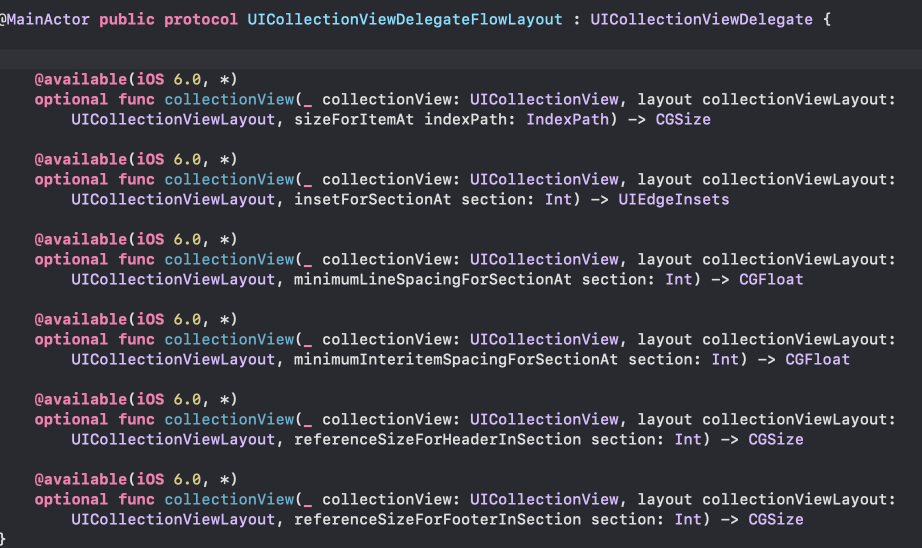 - UICollectionViewFlowLayout을 통해 컬렉션뷰 레이아웃을 구성하고자 한다면, UICollectionViewDelegateFlowLayout 프로토콜을 구현하면 된다.