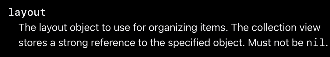 이게 없으면 UICollectionView는 어떤 형식으로 보여줘야할지 모르기 때문에 반드시 layout을 지정해야한다. (Must not be nil)