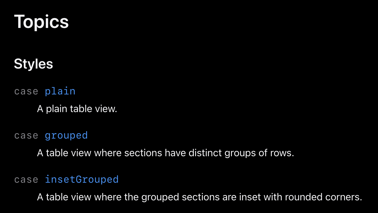 TableView의 3가지 style section의 개념 = header + rows + footer grouped는 header와 footer의 간격을 늘려주는 것 inset grouped는 rows들의 bounds가 둥근 모형으로되고 row양 옆에 inset이 들어가는 것 plain grouped inset grou