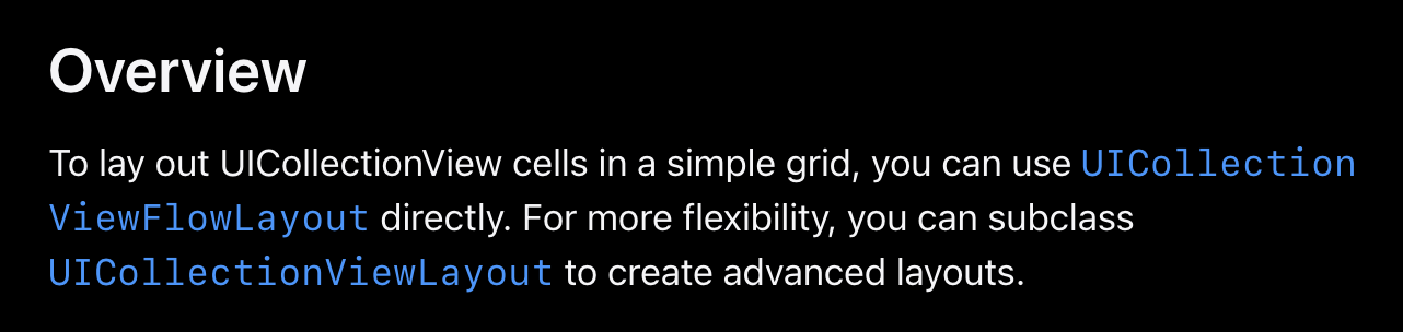 단순한 그리드 형식이라면 UICollectionViewFlowLayout을 사용해라! 더 복잡한 레이아웃을 구현하고자 한다면, UICollectionViewLayout을 상속한 다른 클래스 레이아웃을 구현해라! 라고 나와있다.