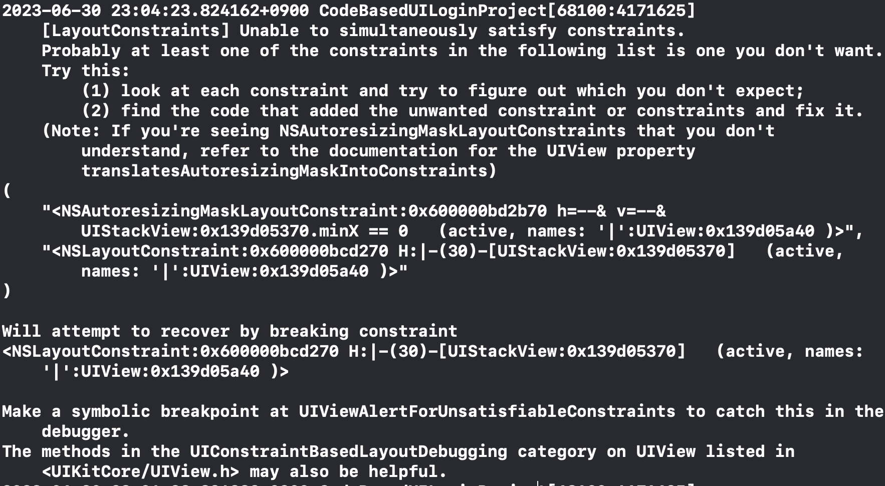 코드로 constraint를 잡을 때 이 오류가 뜨면서 레이아웃이 잡히지 않는 이슈가 있으면, translatesAutoresizingMaskIntoConstraints = false를 주면 된다고 하는데, 이 오류가 왜 뜨고 이 설정이 왜 필요한지 궁금해서 찾아봤다.