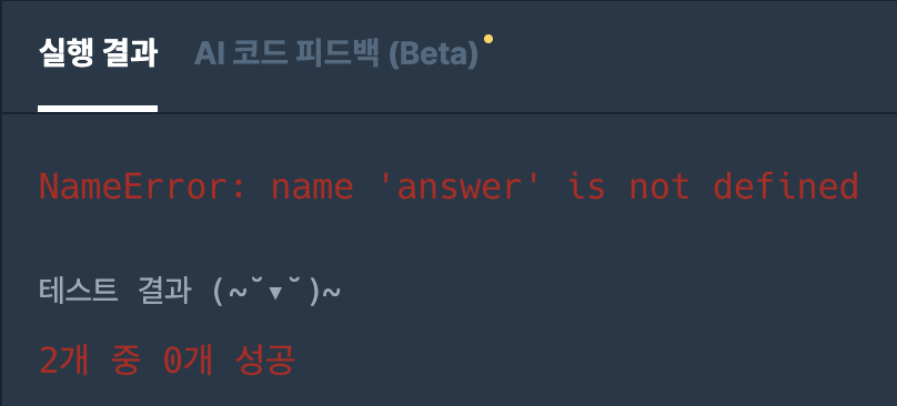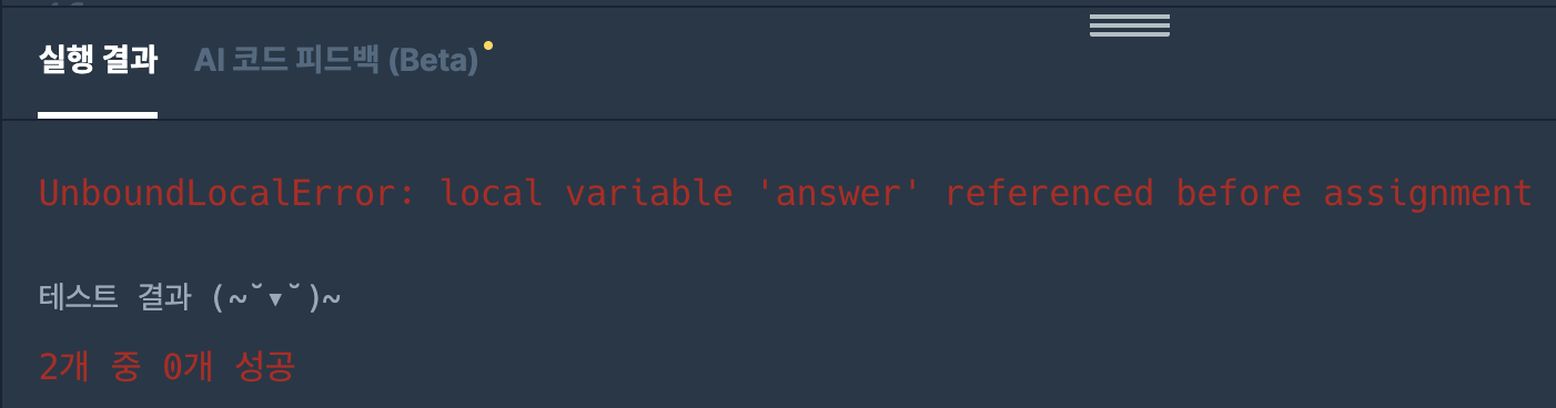 - 위에서 answer를 global로 선언하였지만, 막상 answer가 solution 함수의 내부 로컬 변수이지 전역변수가 아니기 때문에 찾을수가 없음