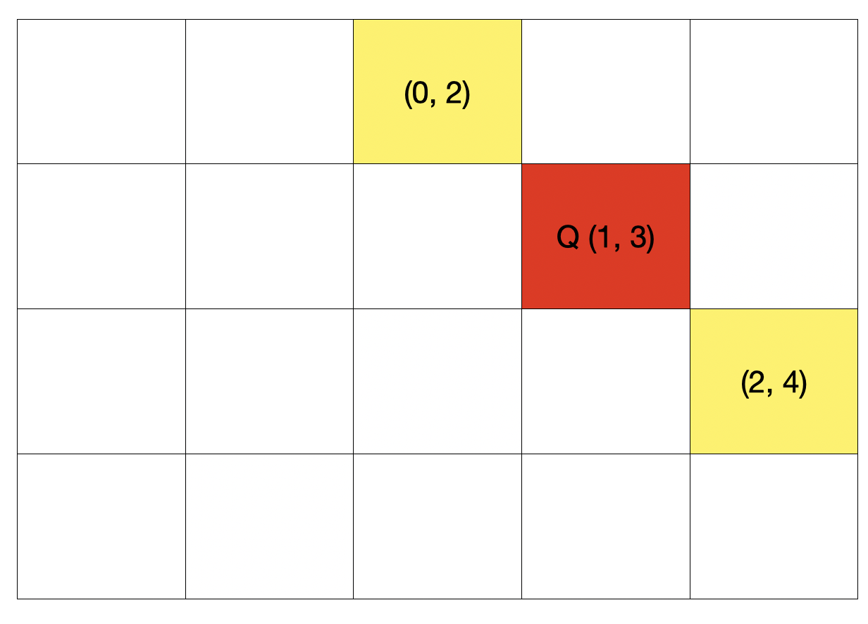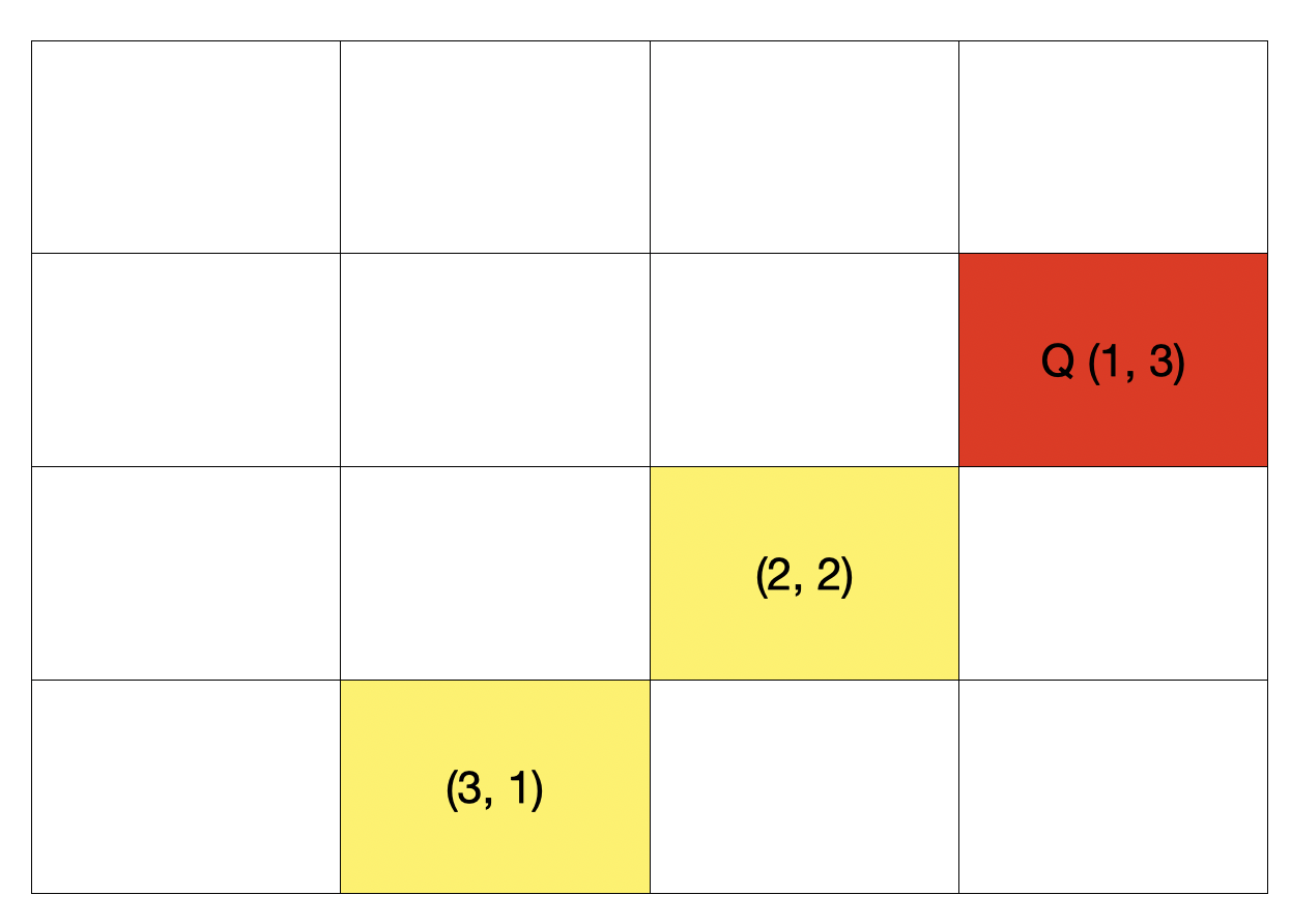 만약 현재 퀸이 (1, 3) 위치에 있다면, 3 - 1 = 2이므로 diagnoa2[3 - 1 = 2]가 True라면 대각선에 퀸이 위치하고 있다고 보아도 될 것이다. 노란색 칠한곳 각각 계산하면 2 - 0 = 2, 4 - 2 = 2