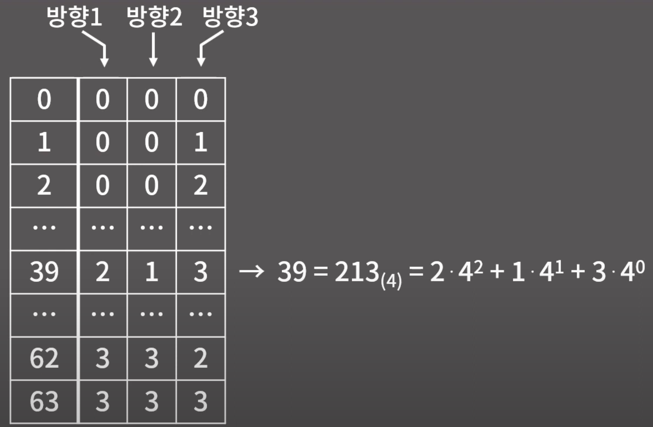 - 문제는 여기서 어떻게 각 cctv의 방향을 정하냐 인데, 방향이 총 4가지이므로 4진수를 구함으로써 방향을 정할 수 있다.