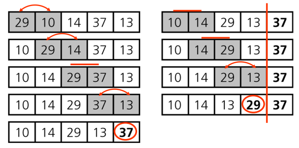 이 과정이 한번 완료되면 가장 큰 값이 배열의 오른쪽 끝으로 이동한다.