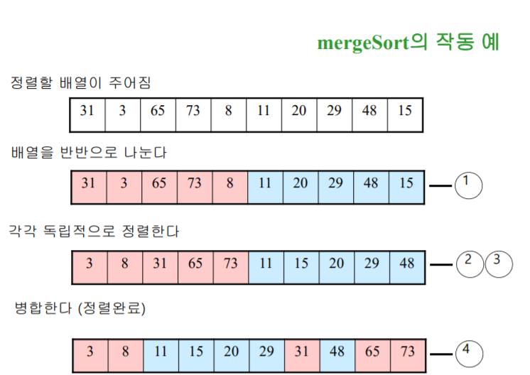 합병 정렬은 순환 알고리즘을 적용할 수 있는데, mergeSort라는 분할된 배열을 정렬하는 함수와 merge라는 정렬된 배열을 합하여 정렬된 하나의 배열을 만드는 함수로 이루어진다.