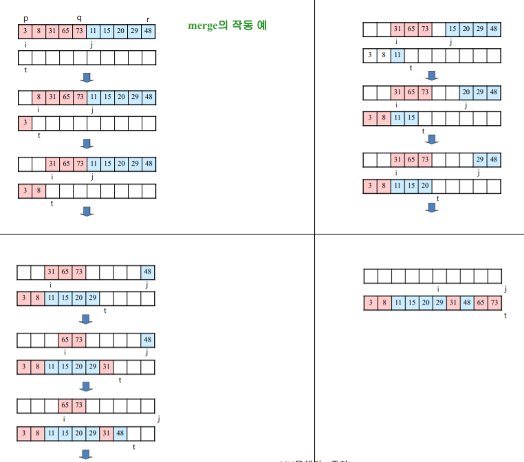 - 병합(combine) : 정렬된 부분 배열들을 하나의 배열로 통합한다.