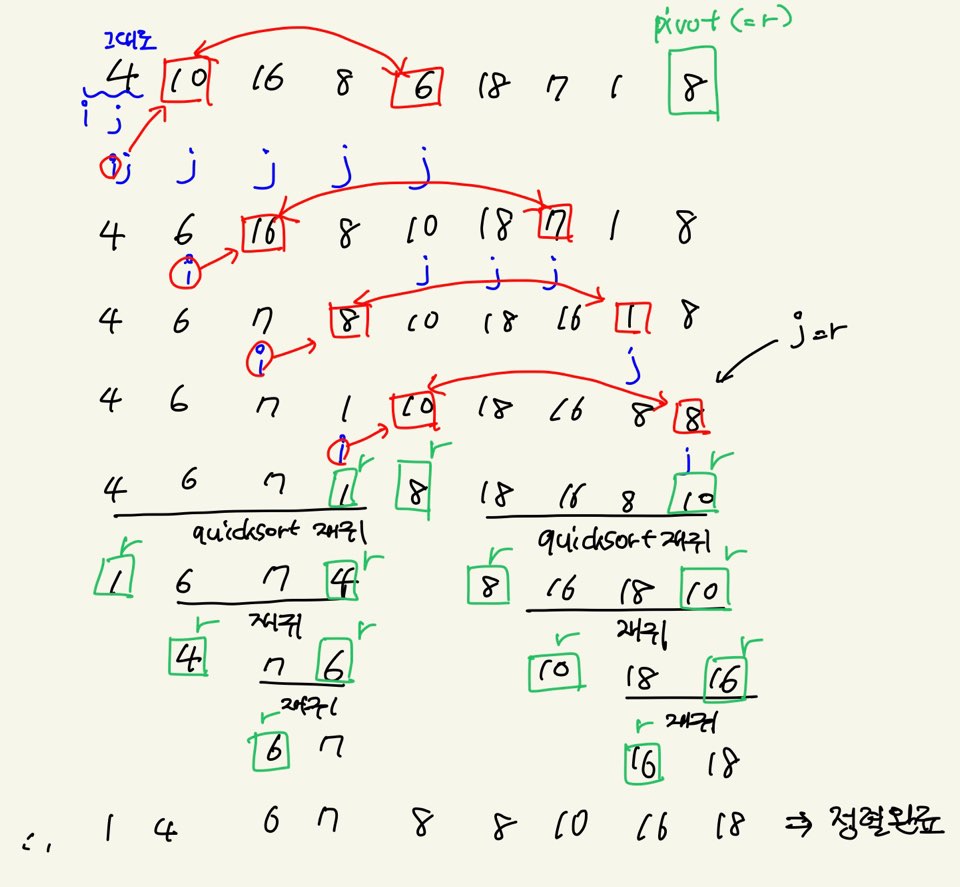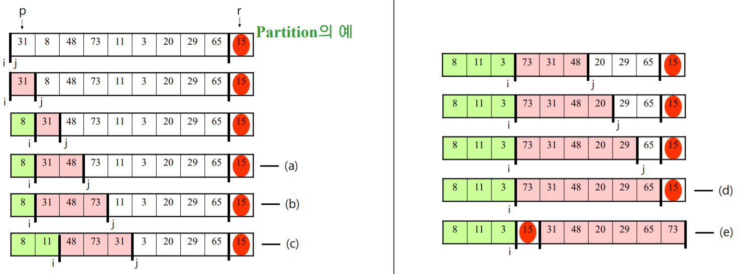 i는 left-1부터, j는 left부터 시작하여 이동한다. j는 pivot보다 작을 때까지 이동하고, 찾으면 i가 가리키는 다음 수와 j가 가리키는 수를 교환하고, 이 때 i는 오른쪽으로 이동한다.. 이 과정을 반복하고 j가 pivot의 위치에 도달하면 i의 다음 위치에 있는 수와 pivot을 교환하고, i의 다음 위치 인덱스를 반환한다.
