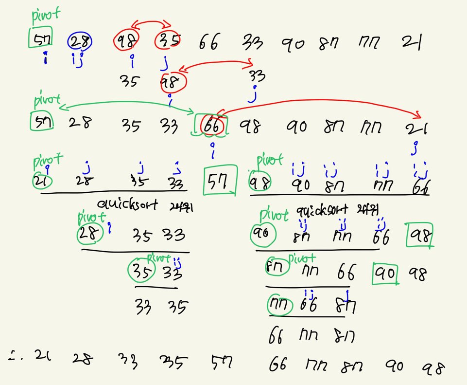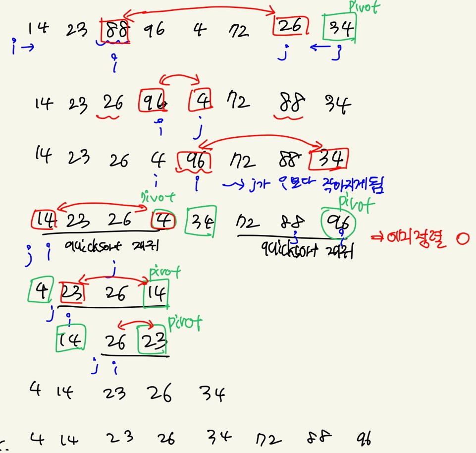 - 퀵 정렬은 추가 메모리 공간이 필요하지 않고 불필요한 데이터의 이동을 줄이고, 한번 결정된 피벗들이 추후 연산에서 제외되기때문에 빠른 정렬 방법이다.