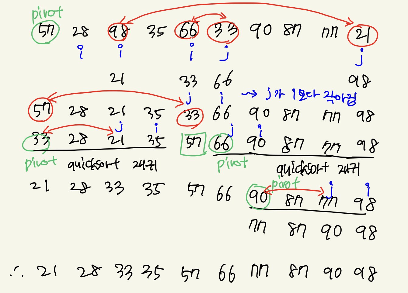 //마지막 요소가 pivot이고 i는 왼쪽에서 오른쪽, j는 오른쪽에서 왼쪽으로 움직일때