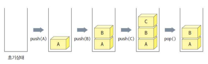 데이터를 쌓아 올리는 자료형 -> 후입 선출 형태(LIFO:Last-In First-Out, 가장 최근에 들어온 데이터가 가장 먼저 나감)