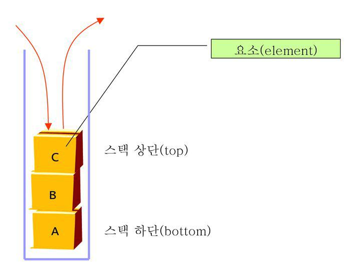 - 스택 상단(top) : 스택에서 입출력이 이루어지는 부분