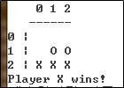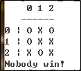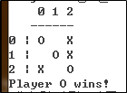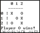 출력: O 혹은 X가 그려진 게임판이 출력되며 둘 중에 한명이 우승한 경우 누가 우승했는지 출력하고 종료한다.