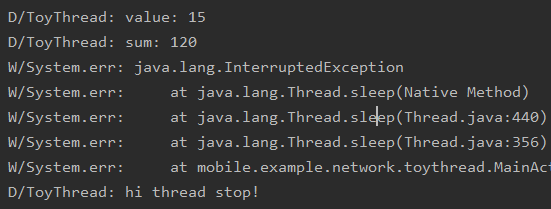 if (thread != null) thread.interrupt(); // InterruptedException 생성 => 실행하고 있는 도중 현재의 결과 출력하고 멈춤
