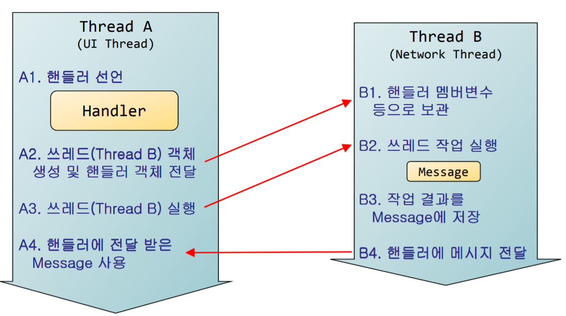 별도의 쓰레드에서 Main Thread(UI Thread)에 직접 접근할 수 없으므로 데이터를 통신할 방법이 필요함 -> 이때 사용하는게 Handler