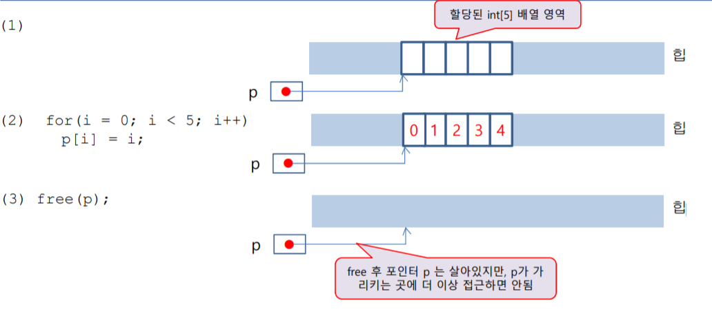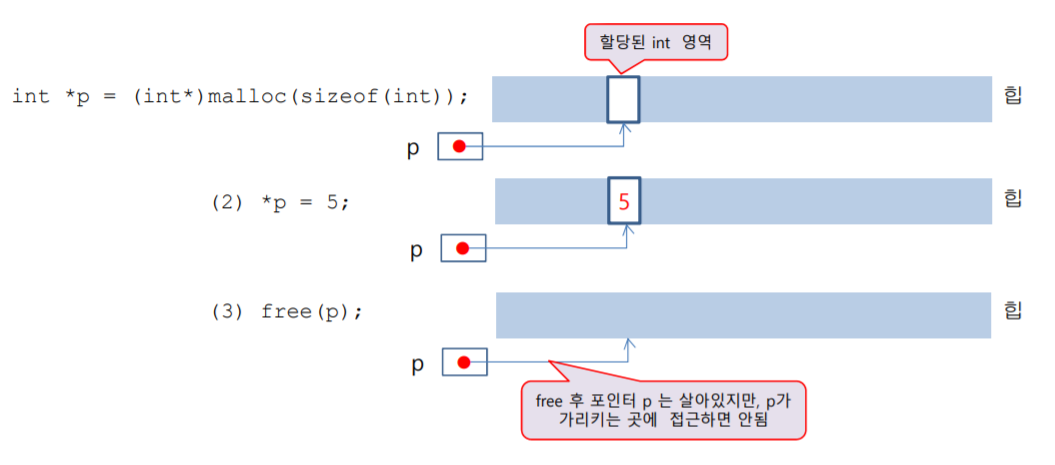 - malloc() 함수 : 힙(heap)에 size 바이트 만큼의 메모리 블록을 할당한다. 또한 동적 메모리 블럭의 시작 주소를 반환한다. 이 때 반환되는 주소의 타입은 void *이므로 이를 적절한 포인터로 형변환 시켜야한다. 따라서 malloc 함수 앞에 (데이터 타입*)을 입력하여 형변환한다. malloc()은 시스템의 메모리가 부족해서 요구된 메모리를 할당할 수 없으면 NULL을 반환하므로 NULL인지 검사하는 과정이 필요하다.