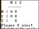 출력: O 혹은 X가 그려진 게임판이 출력되며 둘 중에 한명이 우승한 경우 누가 우승했는지 출력하고 종료한다.