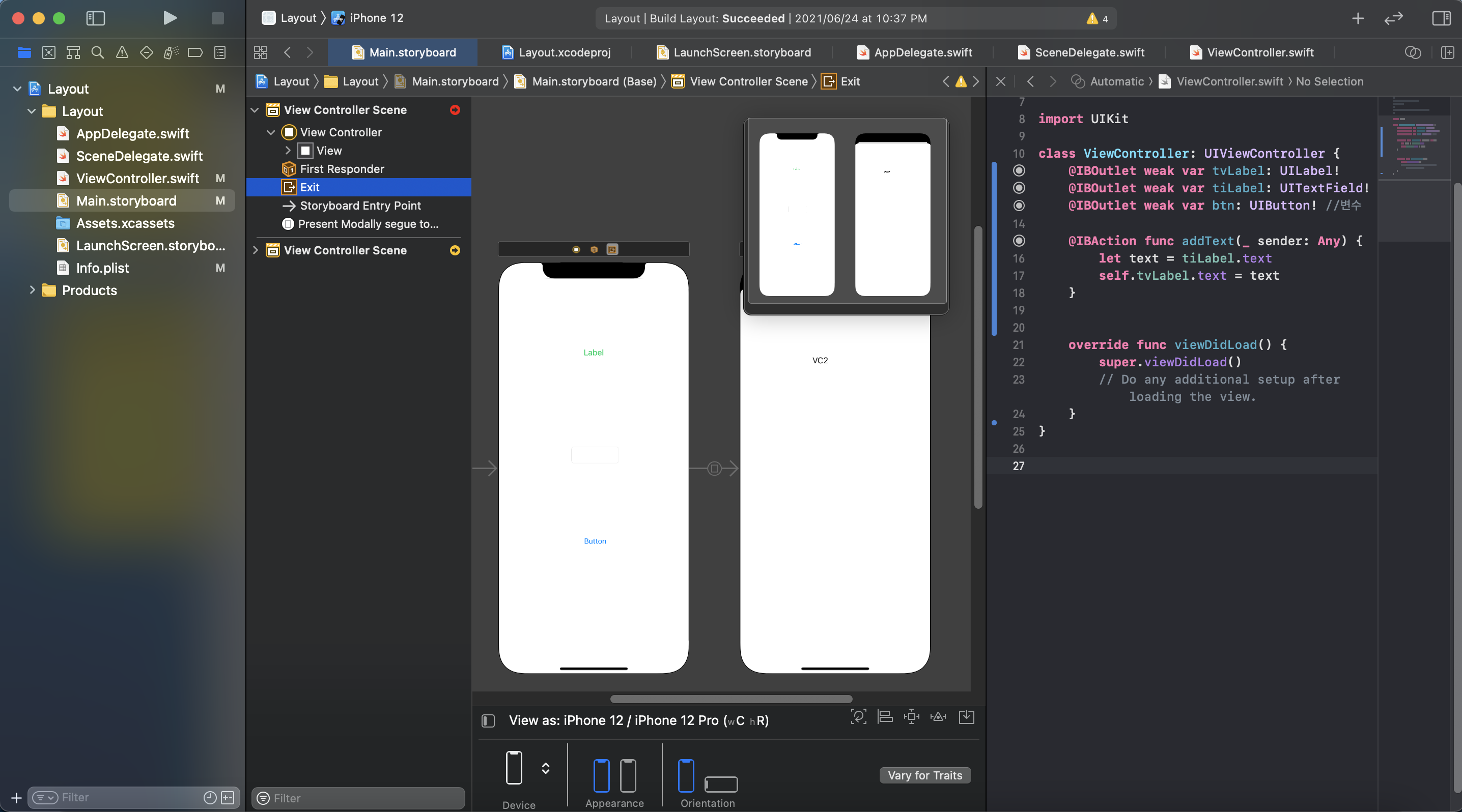 ViewController 디자인과 코드를 같이 보려면 오른쪽 상단 아이콘을 눌러 Assistant 모드로 세팅